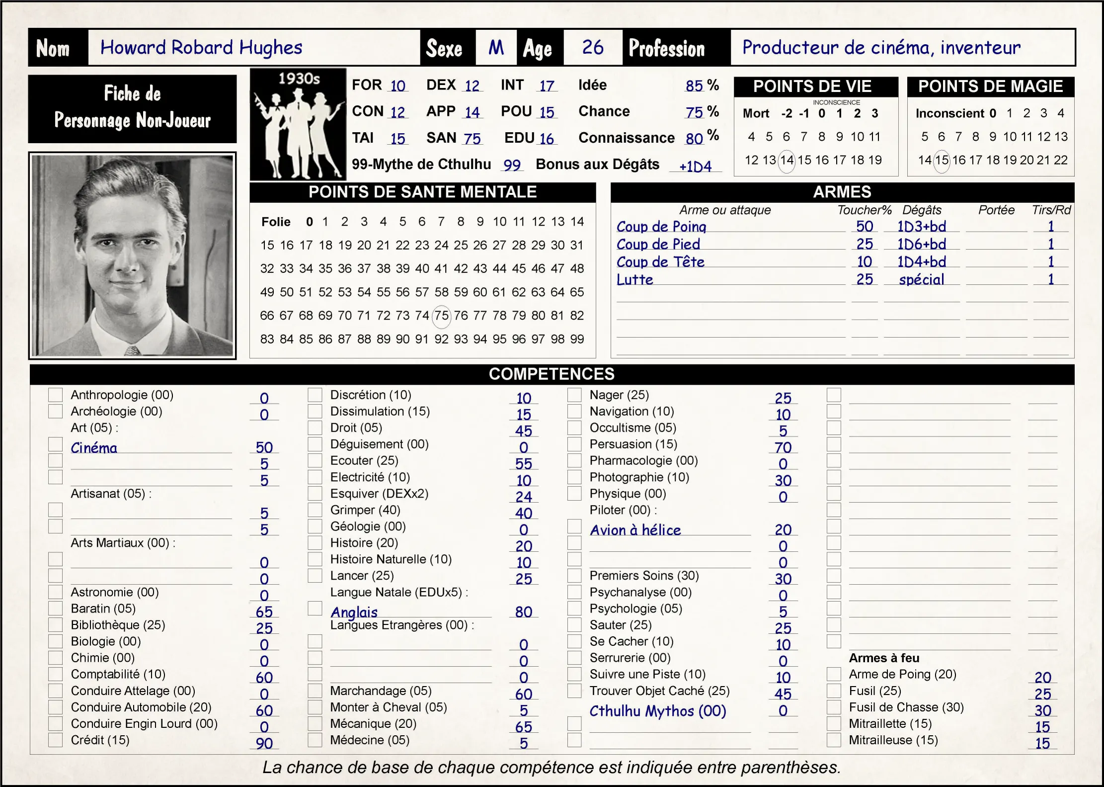 - Fiche de PNJ Appel de Cthulhu